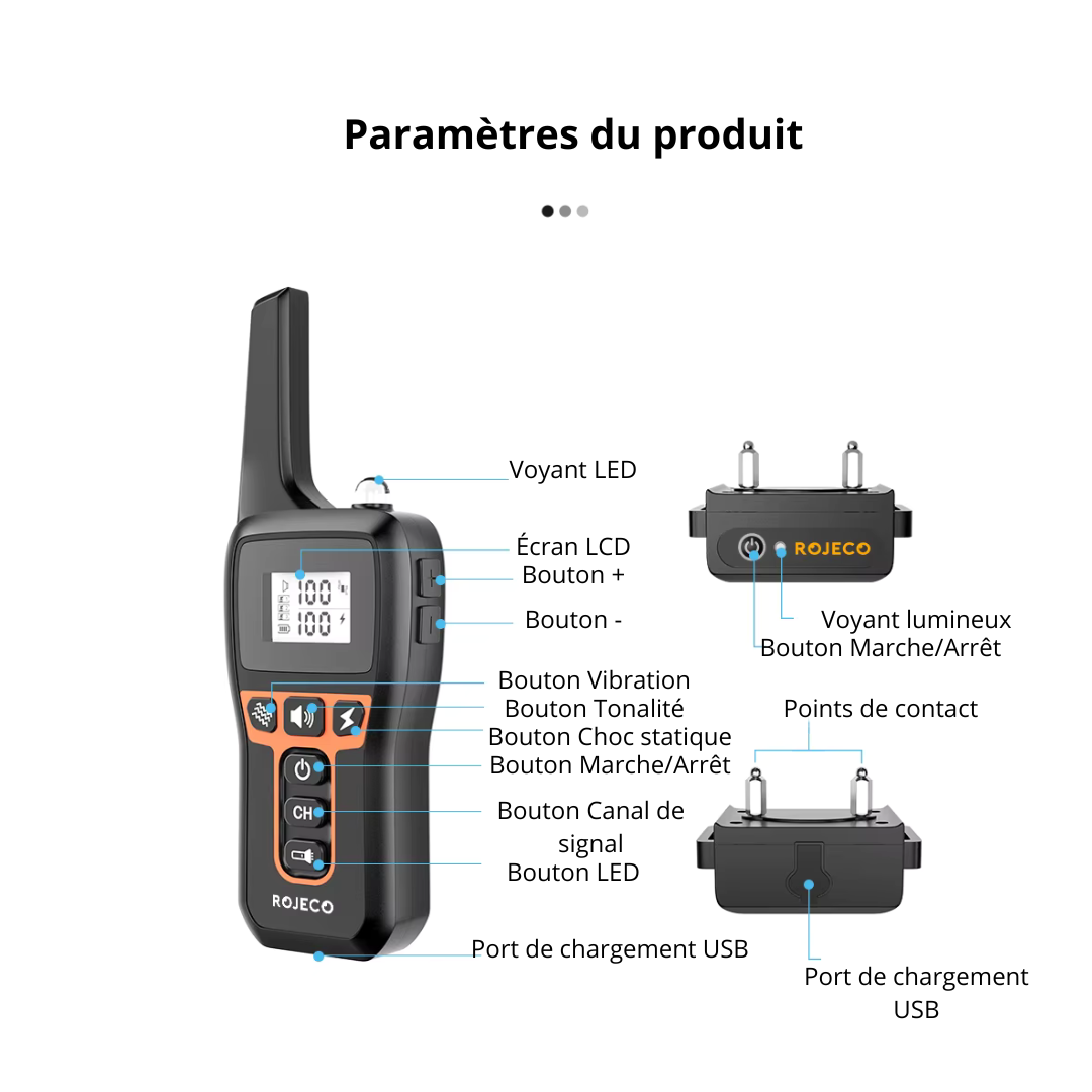 🔋 Recharge rapide USB — pour le collier et la télécommande; indicateurs de batterie clairs.