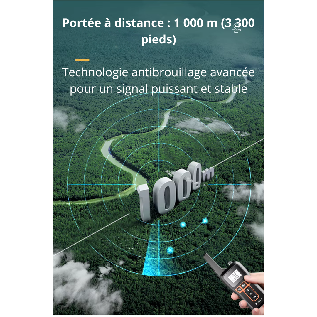 Tour de cou conseillé : ≈ 15 à 65 cm (sangle découpable). Récepteur compact et léger pour moyen/grand chien. Portée jusqu’à ~1000 m en environnement dégagé. (Peut varier selon le terrain et les obstacles.)