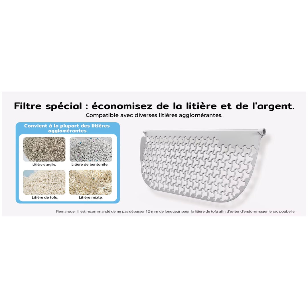 🧩 Compatible multi-litières : agglomérantes (tofu/bentonite/minérale) à grains fins.
