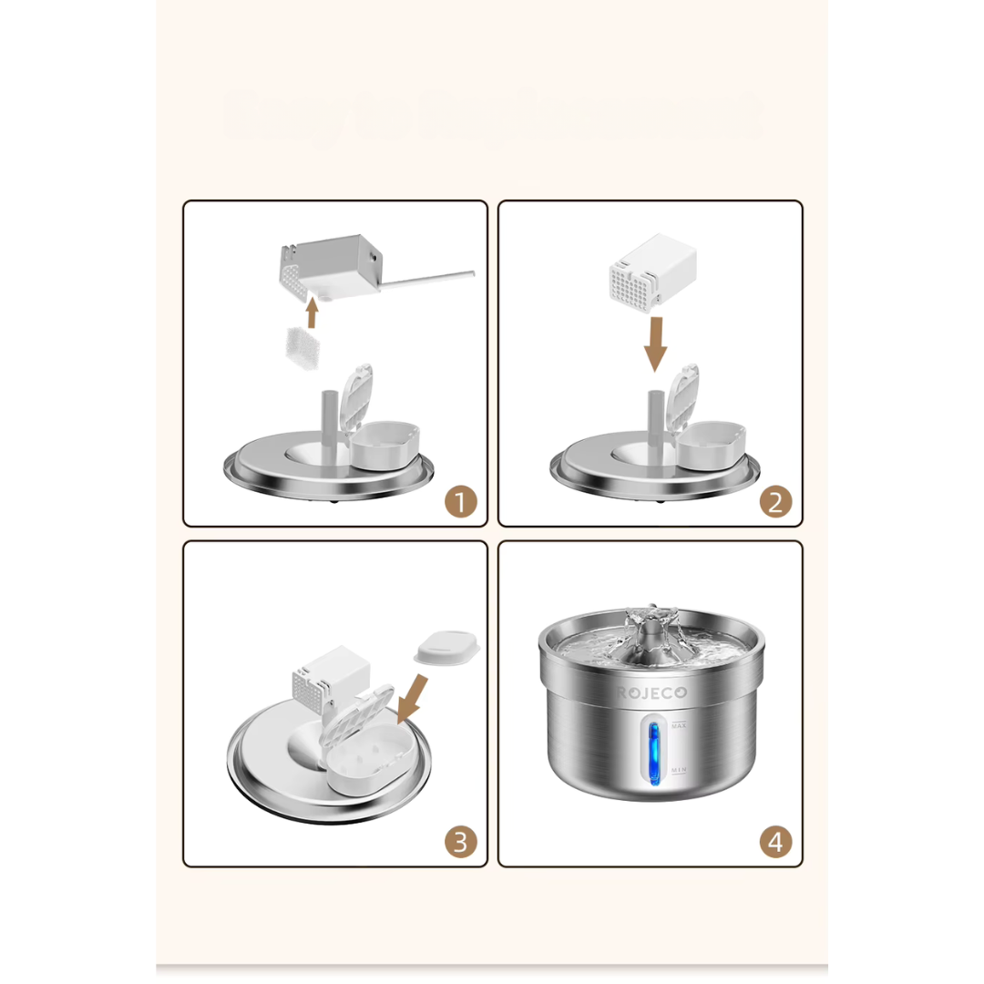 Tremper 5 min et rincer 30 s avant usage. Remplacer la cartouche toutes les 2–4 semaines ; nettoyer le rĂ©servoir 1×/semaine ; rincer la pompe et retirer les dĂ©pĂŽts 1×/mois. Ne pas utiliser de savon sur le filtre.